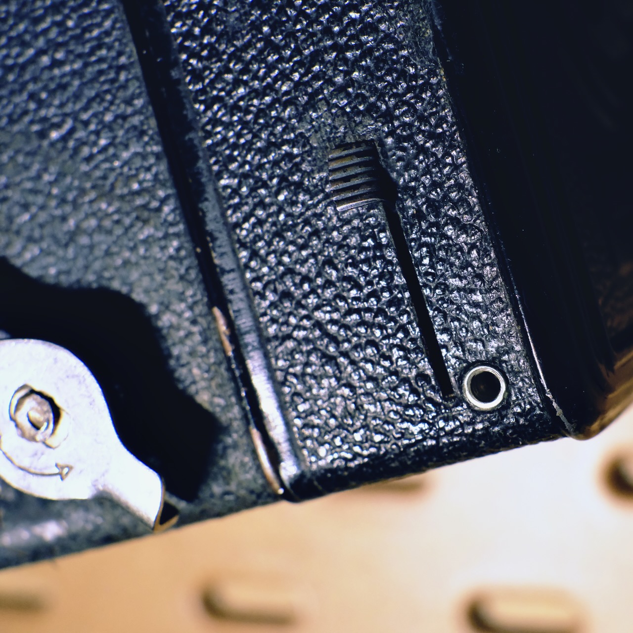 Pulling out the film advance knob and pushing the handle in unlocks the camera back, which you then simply pull off with loud metallic clank, the camera being about as sturdy as a tin can.